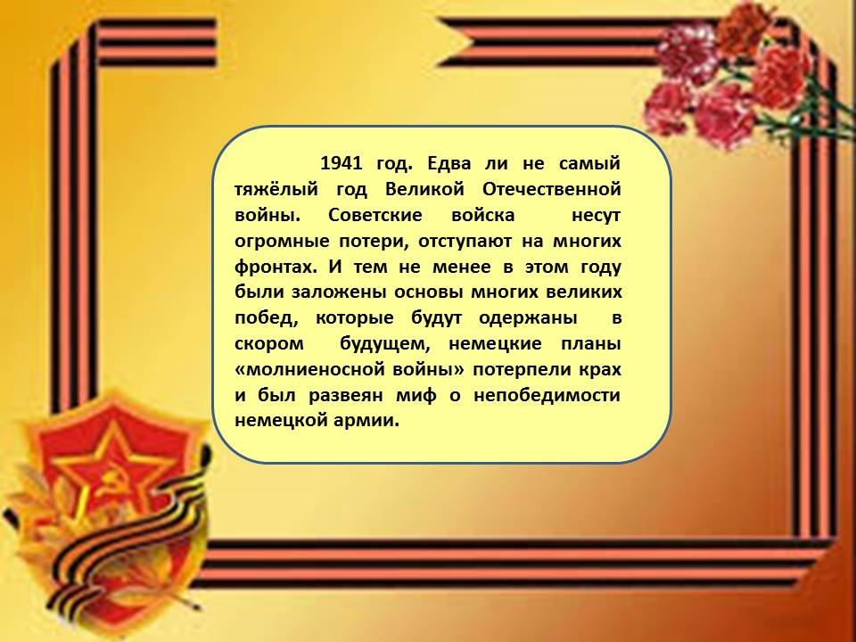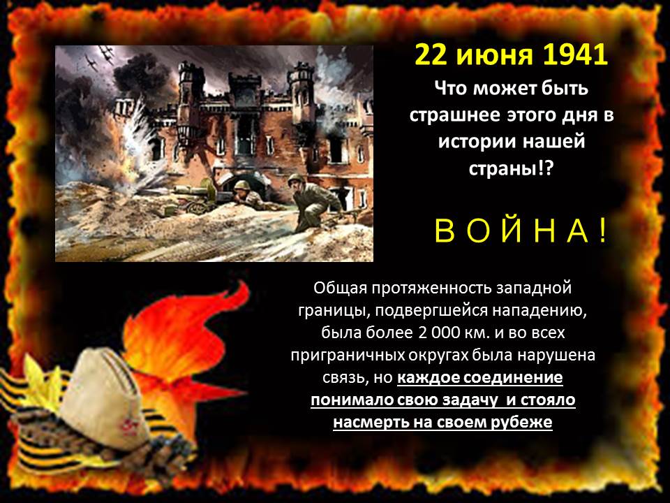 Великая Отечественная война, навязанная Советскому Союзу германским фашизмом, была беспрецедентной по масштабам и ожесточённости. Советский народ сумел выдержать небывалый по силе удар врага, сорвать его планы, а затем, разгромив его полчища, одержать всемирно-историческую победу. В истории нашей страны не было более трагического испытания, чем война, начавшаяся 22 июня 1941 года. Задуманная как война на истребление, она поставила вопрос о нашем историческом выживании. Эта война изменила судьбу всей страны и каждого в ней живущего.