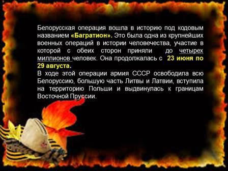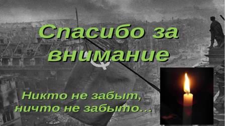 Но беспримерный подвиг народа, сумевшего одолеть сильного и коварного врага, проявленные им невиданная сила духа, патриотизм, преданность Отчизне и высочайшая ответственность за её судьбу, никогда не сотрутся в людской памяти. Великая победа была и остаётся для нас мощной духовной опорой, источником гордости за наше славное прошлое; укрепляет чувство национального достоинства и самоуважения.