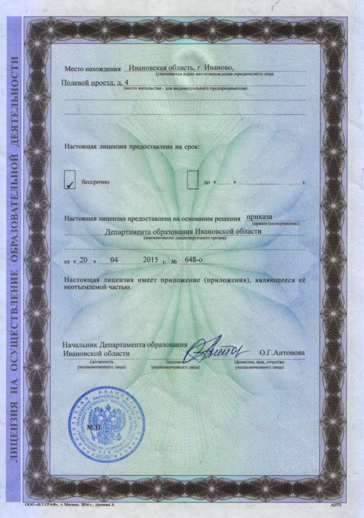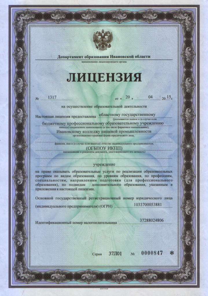 - Лицензии на осуществление образовательной деятельности № 1317 от 20.04.2015